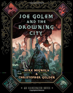 Joe Golem And The Drowning City is a supernatural illustrated novel that is the latest collaboration between author Christopher Golden and comic writer/artist Mike Mignola, which means Mignola drew a cover and some awesome artwork to pepper throughout an otherwise straightforward fantasy novel that was released in March.The two have been frequent collaborators since shortly after Hellboy began publishing, and Golden has even written three Hellboy prose novels along with he and Mignola’s many other collaborations. In this case, it seems like Mignola’s getting a lot more ink for the book than, you know, the guy who actually wrote the thousands of words… but I guess most outlets assume nerds need a familiar anchor. Hell, even I headlined it that way.