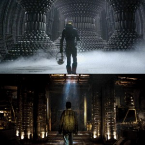 Christianity’s most befuddling, bewitching contradiction – that death is the key to life – is also one of Prometheus’ primary preoccupations both literally and figuratively. Note that the alien mural located in the “Ampule Room” evokes the image of Christ on the cross – the primary symbol of the death-as-life idea in the Christian faith. The film’s recurrent theme of self-sacrifice, embodied, at various points in the narrative, by the Engineer who appears to destroy himself in order to jumpstart new forms of life, by Holloway’s suicide-by-flamethrower, by Janek’s kamikaze maneuver, evokes the sacrifice that “God” figures like Christ, Osiris, and Prometheus undertake on mankind’s behalf.