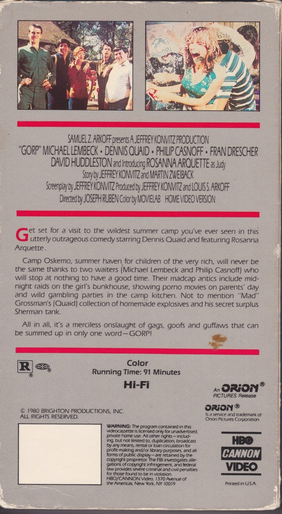 When I saw this movie as a kid, I thought it was one of the funniest things ever. Broad comedy works well on teenage boys. Its humor now relies entirely on post-irony, but that works for me, too. To be honest, the only problem I have with GORP is that I still don’t know what the title is supposed to mean. Is GORP an acronym? Is it slang for something naughty? An inside joke amongst the filmmakers? Does anybody know? The movie provides zero explanation, but if I were to guess, I’d say it refers to the state of mind it creates. I’m all GORP‘ed out.