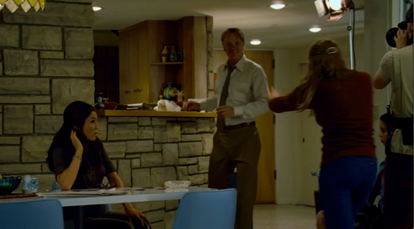 Years of dealing with Kardashians has established a distinction between content and truth on reality TV. Much of the drama may have happened in the moment, but editors create the narrative. Cinema Verite loves this notion. Opening on a television playing clips of the real American Family series, before being moved out of the frame by Tim Robbins’ eerie Bill Loud simulacrum, the film reminds us of its own falseness almost immediately. The camera pans out on editors constructing the story, setting up a film that attempts to mimic moments from the show, but also explicitly separate the real from the fake.
