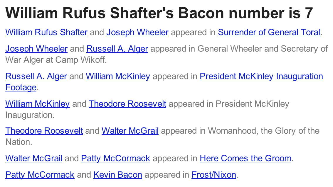 It’s worth pointing out that OracleOfBacon.org has long has a system for running just such a search (and it’s more customizable with other actors), but when a monolith like Google makes it so easy for the masses, I think we can say the game is well and fully ruined.