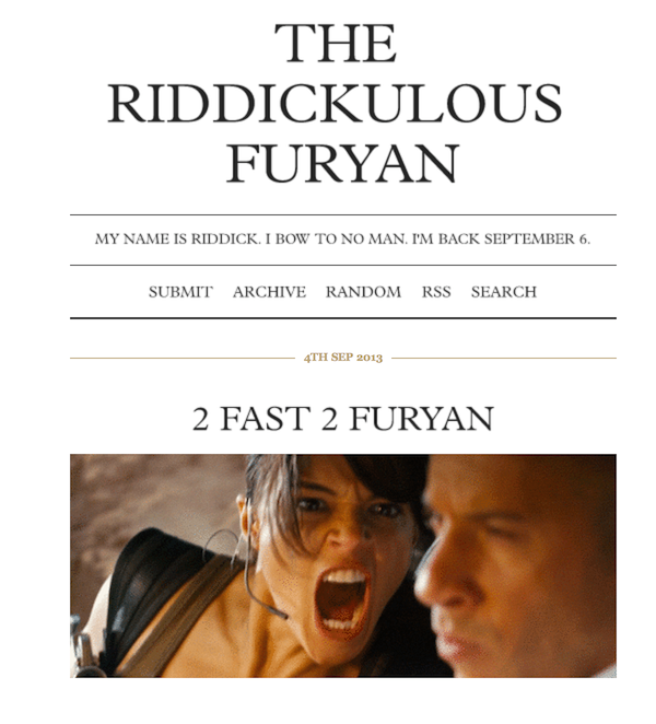 I don’t know for a fact that this is an official marketing effort from the Riddick team but, come on, it must be. Every inch and forced meme of this laughable Tumblr blog (complete with ubiquitous minimalist theme) smack of cynical, “well this is what the kids these days are up to” order from a PR supervisor to an intern. That said, I wouldn’t be shocked if it was Diesel himself, or at least whoever runs his official Facebook page, which has always managed a rather stunning level of unintentional hilarity (just scroll through its “cover photo” album sometime).