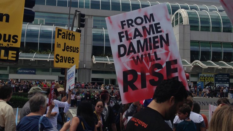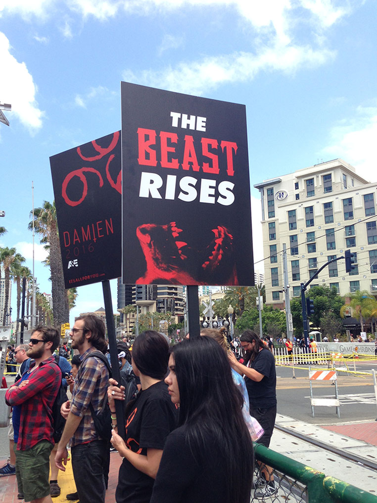 Every year, the convention is picketed by radical Christians. Why? I’m sure it has something to do with worshipping false idols or some other such nonsense (they probably wouldn’t like my Burgess Meredith shrine that I pray to and kiss every night before bed). Taking advantage of this fringe occurrence, the marketing team behind A&E’s upcoming TV reboot of The Omen (given the more marketable moniker of Damien) stood right next to the protesters with signs like this: