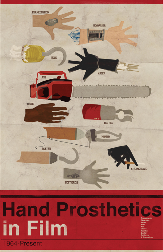 OK, so now you should know that we have a new partner to create luxurious new artwork for CHUD.com and GUY.com. You should have seen (and ordered!) his CHUD.com print. You should have seen (and ordered!) his Midnight Run salute. Next week we are going to unleash his next salute, a film I chose with my neck. But for now I am proud to be the first to share his latest creation: A piece on Prosthetic Hands in Film 1964 – Present…