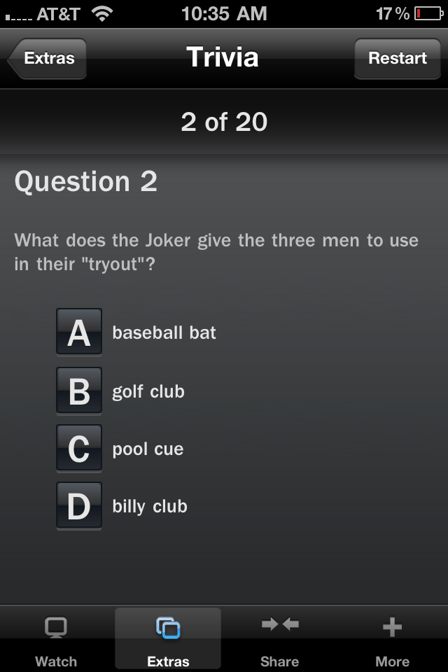 I downloaded the App for The Dark Knight, and while it didn’t play nice with multi-tasking, the app was cleanly laid out and sharp. The streaming video preview was shockingly pristine and uncompressed, even though there is an option to download the preview as well (at 2.2 gigs). I was disappointed in the quality of some of the special features streams* though (the terrible compressed audio was particularly noticeable in a featurette about the Joker’s theme). That said, this app seems smartly geared towards consuming these features in chunks (competing with your Angry Birds time), and a full quality featurette isn’t necessarily conducive to a quickly-loaded VFX reel to watch on the john.