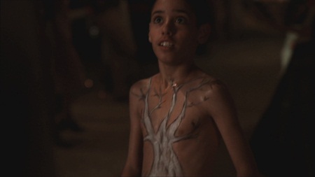 Note also the young boy who literally almost runs into Ben, painted up to resemble the tattooed man we’ve come to know. The “tree tattoo” this boy sports is white, as opposed to black. Is there a symbolic component to this detail? Or did white simply show up better on camera? The symbolism of the townspeople chasing this boy on the Day of the Dead and then returning, bearing him up as a kind of king, suggests two things: (1) the fear of death and death’s inevitable triumph (death is “king”) and (2) the tattooed man represents/embodies death. Interested to see the show elaborate more on the tattooed dude and the tree he wears.