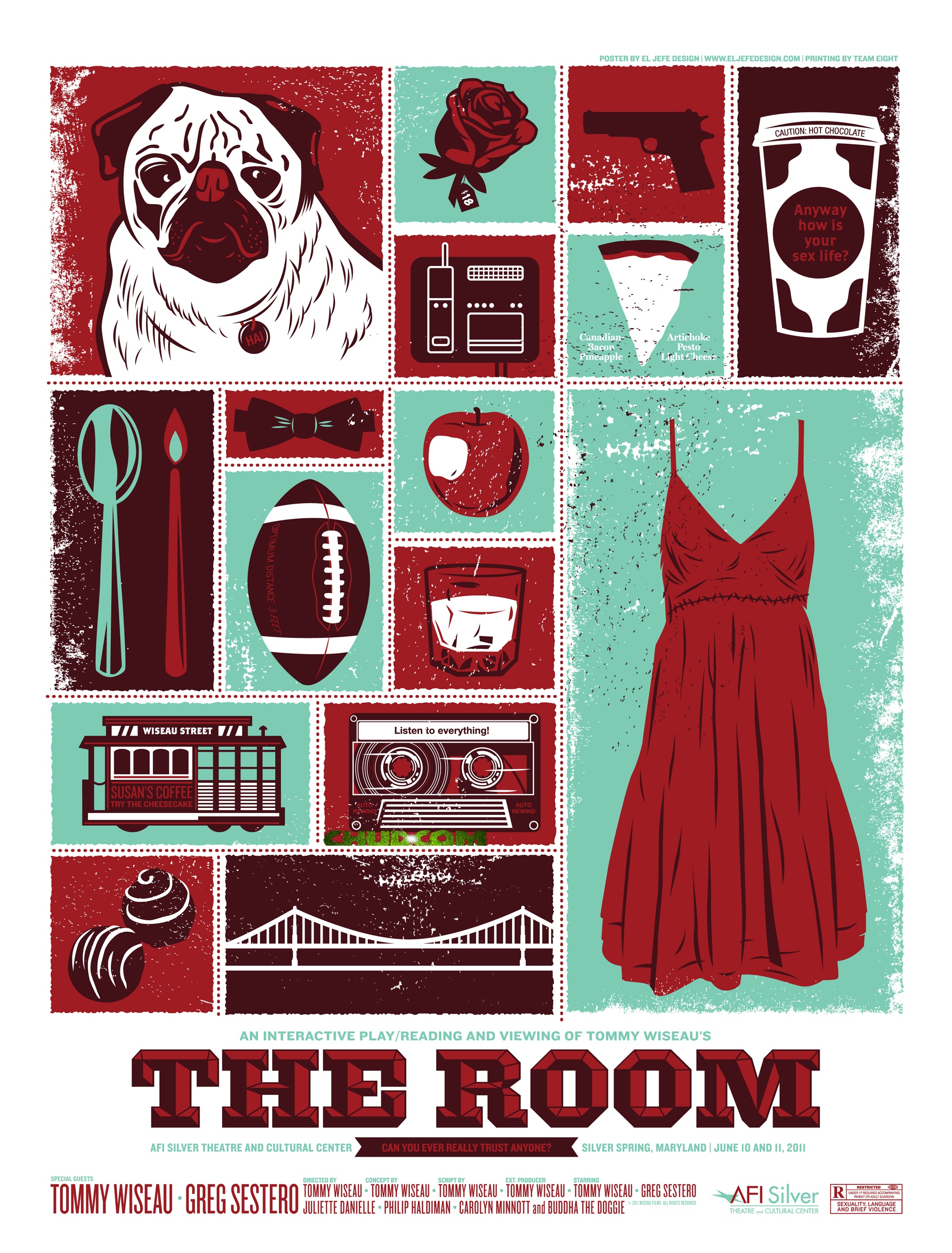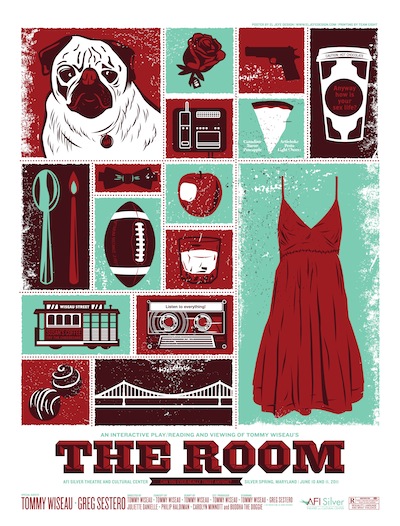 I promised the high-res poster this morning and now here it is, the poster for THE ROOM Play/Reading featuring Tommy Wiseau and Greg Sestero. Frankly, I think the design is better for this image than for any of the Rolling Roadshow posters from this morning. It was designed by Jeffrey Everett at Jefe Design, and I think he did a wonderful job.