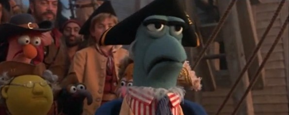 I’m not going to run through the reasoning why our hero should be a Muppet, as it remains the same logic as it did for Carol. Our hero should be a Muppet; Jim Hawkins should have been Kermit; blah blah blah. Jim being a human comes off better in Treasure than it did with Scrooge in Carol because Jim is saddled with Gonzo and Rizzo. Also, he is a pretty boring and personality-less protagonist, carried along purely by the story beats of Stevenson’s tale. Scrooge was a perfect protagonist; that was the problem. Jim being a shitty protagonist forces the Muppets to do more heavy lifting, which is great, but if we’re looking at the film as a film (and not just something to showcase Muppet shenanigans) then we’re still left with a shitty protagonist. Carol was a lousy Muppet film, but it was a wonderful Christmas Carol adaptation. Treasure succeeds and fails, in its own ways, by being the exact opposite. The Muppet shenanigans are honorable, and the movie is funny, but it is held back from being really good by the fact that its not that compelling narratively. Jim is a dud. So his relationship with Silver, the dramatic backbone of the story, exists purely as surface-level plot. Brian Henson wisely never asks us to take the film truly seriously, but nonetheless, almost every scene involving Jim that isn’t going for a laugh provided by a Muppet is a waste of time. So in the end, Treausre is fun and funny but feels something of a lark (though that isn’t so bad, really; don’t want to entirely negate the positives said in the previous section). And I don’t know if Kevin Bishop did his own singing, or if he was dubbed, but in either case Jim’s singing voice is hilariously annoying.