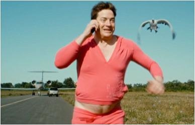 This is not even the worst scene. Since Dan is in women’s clothing and smells of skunk he has to conduct a meeting with his boss by phone on the runway outside the corporate jet. A cartoon stork swoops in to attack him and rather than take refuge in the truck he runs down the tarmac, shrieking while still on the phone.