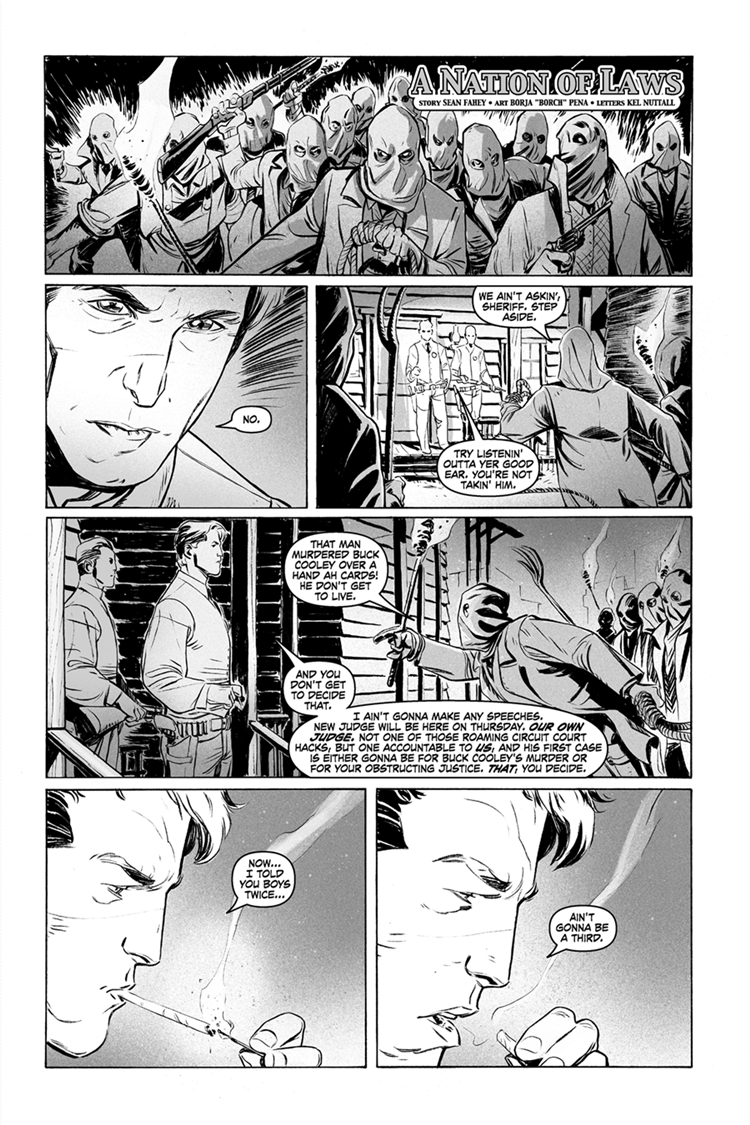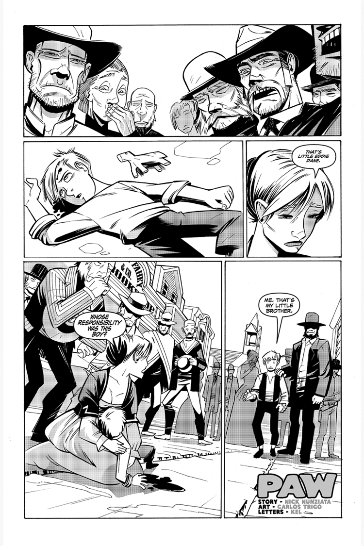 The Western is a perfect genre for comics. There’s a simplicity to them that is utterly magical and easy to be swept away in. It doesn’t even need to have the big “pitch” that many genres do. A Western can simply be a character piece and it’s perfectly fine, provided you get the genre and know mood. The Faheys delivered some poetic and concussive stuff with their first forays, showcasing the not too distant past of hard people, hard days, and the frailty of life itself. My goal was to take my few pages and tell a quick little story about family and obligation, one I feel parallels today quite well. We’ve become a society of litigators and observers. ‘Paw’ exists to show that there’s some value in the old school.